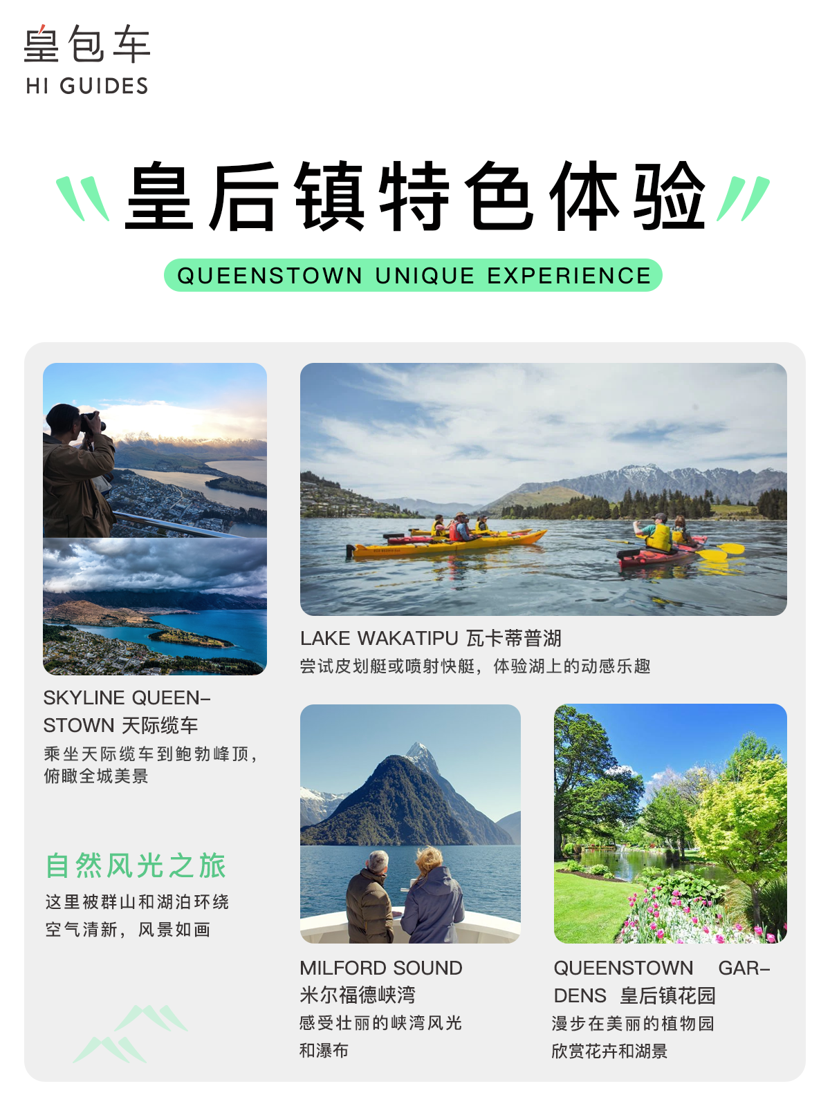 🏔️ 瓦卡蒂普湖:碧蓝的湖水与巍峨的群山相映成趣,是水上活动和摄影的绝佳场所。 🚠 皇后镇山顶缆车:乘坐缆车到山顶,俯瞰整个皇后镇的壮丽全景。 🪂 高空跳伞:感受从高空俯瞰皇后镇的惊险与刺激,心跳加速的体验不容错过。 🎿 里马克布尔滑雪场:冬季滑雪者的天堂,适合不同水平的滑雪爱好者。 🏞️ 米尔福德峡湾:乘坐游船畅游峡湾,欣赏壮观的冰川、瀑布和海豚等野生动物。 🍷 吉布斯顿葡萄酒区:品味新西兰顶级葡萄酒,感受独特的酒庄文化。 🚤 喷射快艇:在湍急的河道上乘坐高速喷射快艇,体验惊险刺激的水上冒险。